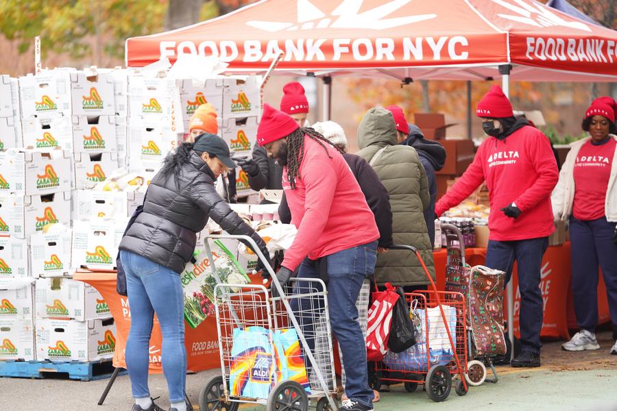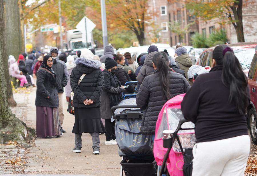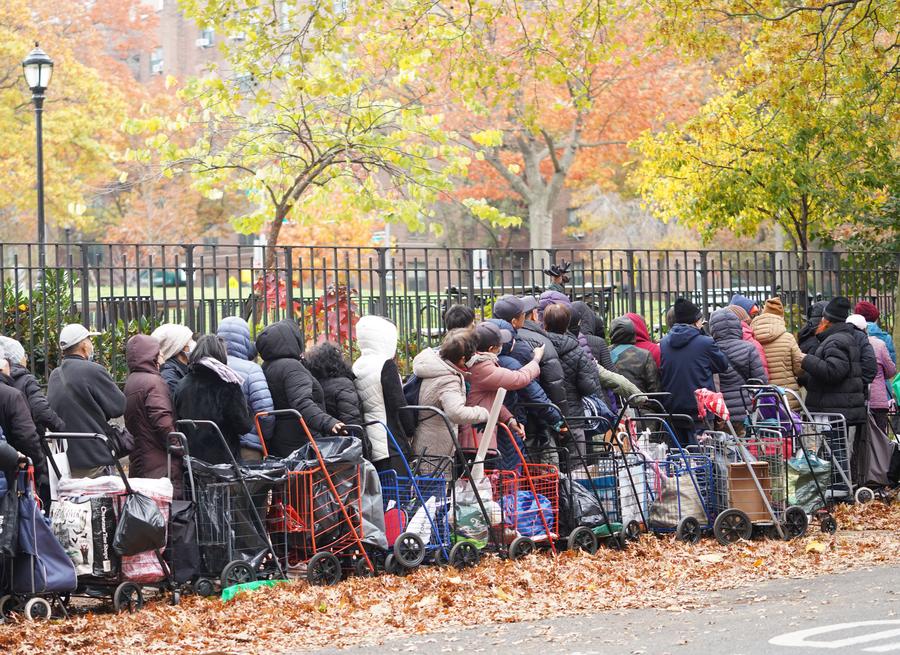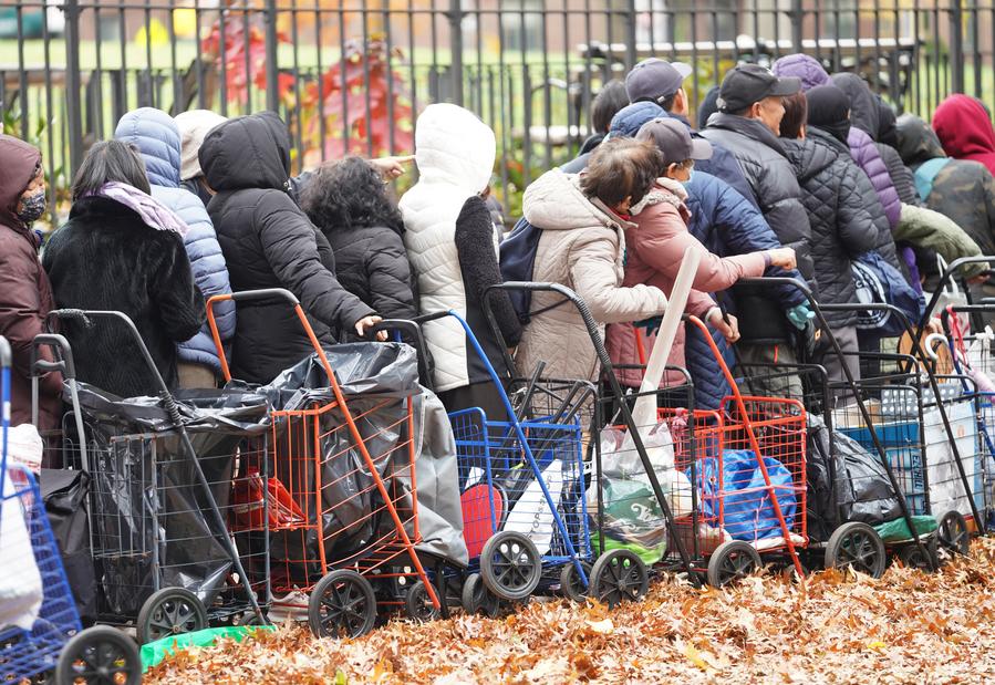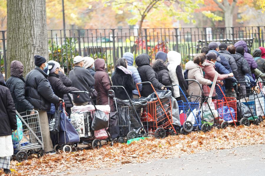 【新華社ニューヨーク11月12日】米東部ニューヨーク市クイーンズ区では冷たい風が吹く中、フードバンクが設置した配布所に人々が列を作り、食料や日用品の受け取りを待っていた。