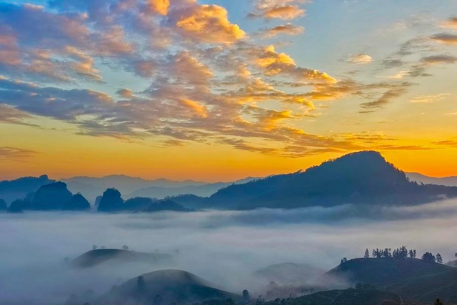 【新華社武夷山12月18日】中国福建省の武夷山国家公園で17日早朝、鮮やかな朝焼けが空を染めた。薄い霧の中で山影が見え隠れし、暖かな色合いの日差しが雲を照らす壮麗な光景が広がった。
