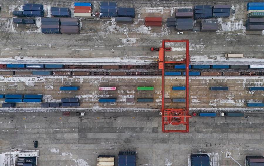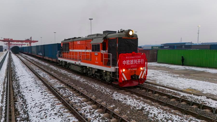 【新華社ハルビン12月20日】中国黒竜江省の鉄道を管理・運営する中国鉄路ハルビン局集団は18日、国産自動車部品を積んだ中欧班列(中国と欧州を結ぶ国際定期貨物列車)を今年初めて運行した。コンテナ55個で編成された列車は同省のハルビン国際コンテナセンター駅を出発し、内モンゴル自治区の満洲里口岸(通関地)を経て欧州へ向かう。