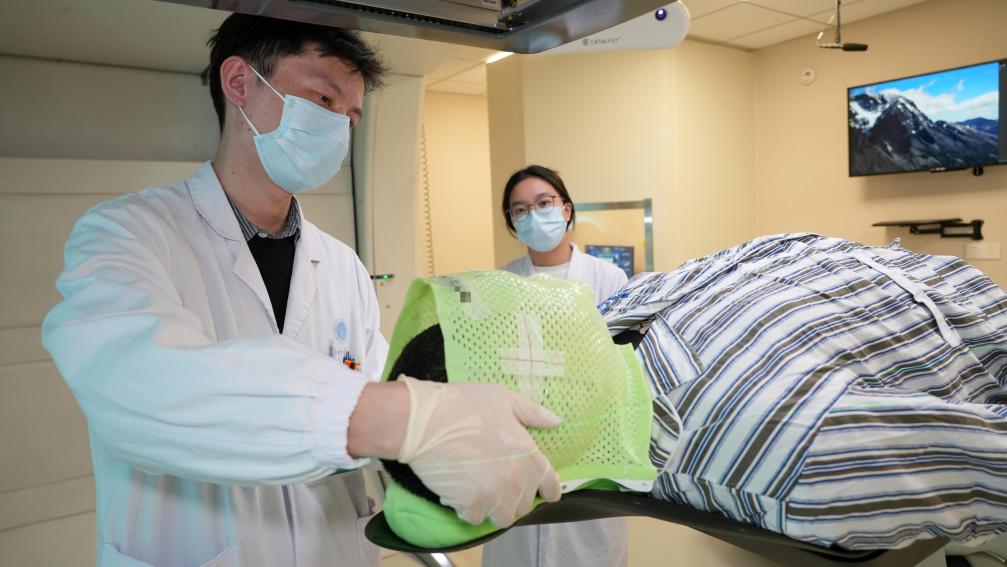 華中科技大学同済医学院付属協和医院陽子線医学センターで治療を受ける患者。(武漢=新華社配信)