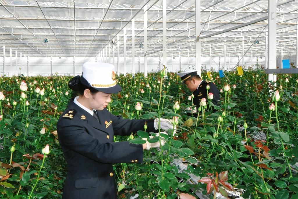 雲南省の輸出花卉栽培拠点で日常的な検査を行う税関職員。(昆明=新華社配信/趙艶梅)