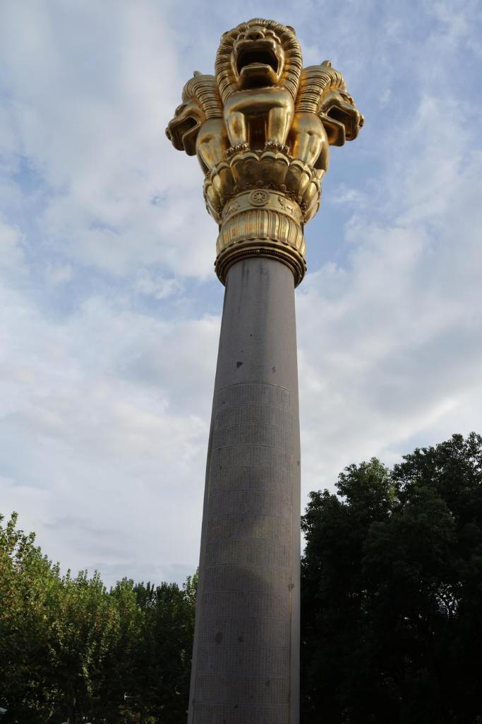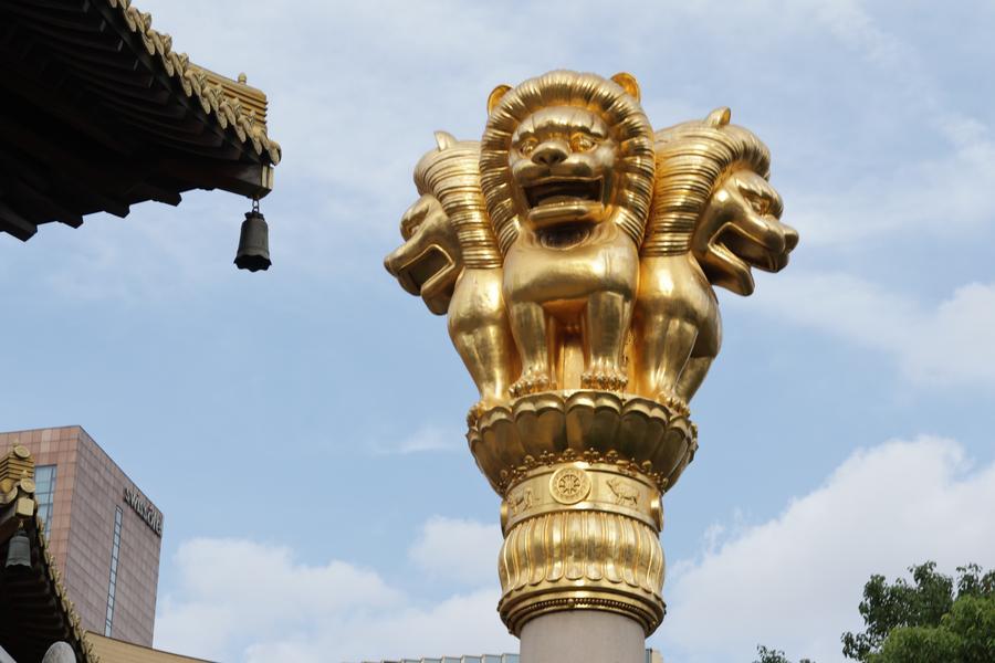 静安寺・阿育王柱の頂部にある獅子の彫刻。阿育王柱の高さは18メートル、直径2・1メートル、重さ160トンで、一つの花こう岩を彫刻している。(11月3日撮影、上海=新華社記者/藍建中)