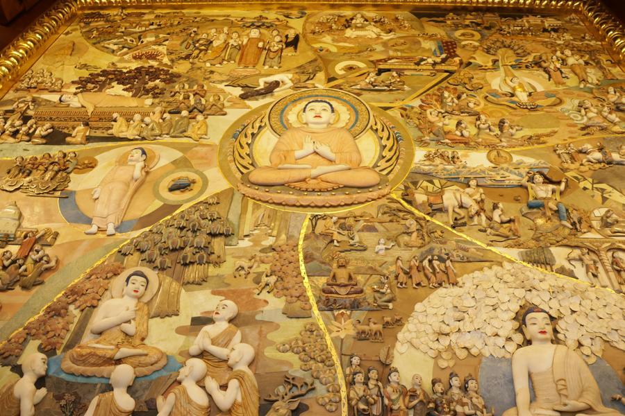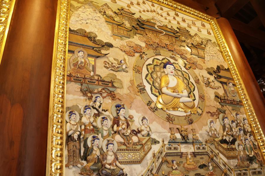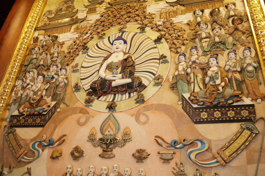 静安寺・大雄宝殿の釈迦牟尼(しゃかむに)仏像背後に配置された玉彫刻。中央の主仏は釈迦牟尼仏。(11月3日撮影、上海=新華社記者/藍建中)