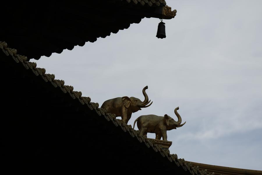 静安寺・牟尼殿の屋根に施された象の彫刻。(11月3日撮影、上海=新華社記者/藍建中)