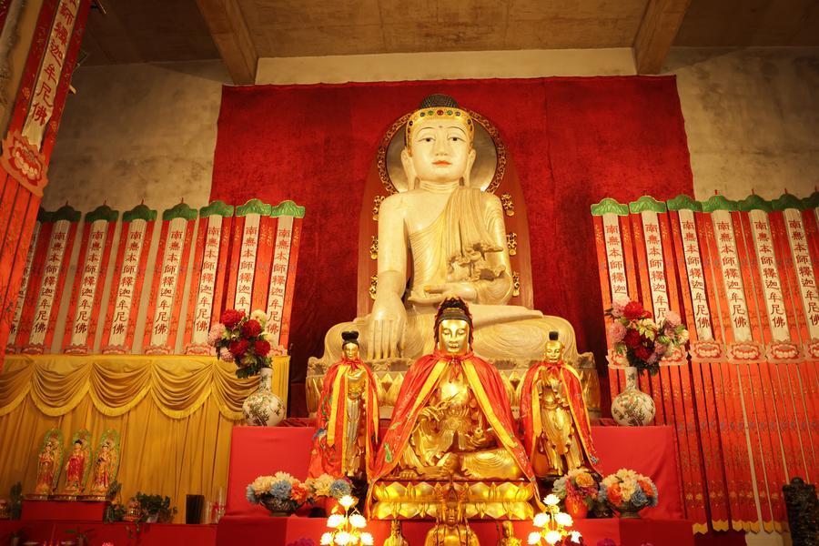 静安寺・大雄宝殿の釈迦牟尼(しゃかむに)仏像背後に配置された玉彫刻。中央の主仏は薬師仏。(11月3日撮影、上海=新華社記者/藍建中)