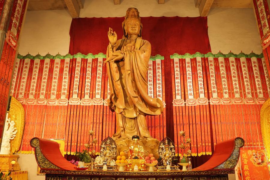 静安寺・観音殿に安置されている観音菩薩像。高さ6・2メートル、重さ5トンで、1本の樹齢千年のクスノキに彫られている。(11月3日撮影、上海=新華社記者/藍建中)