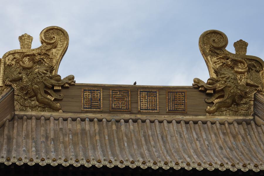静安寺・大雄宝殿の屋根の棟に施された「法輪常転」の彫刻。(11月3日撮影、上海=新華社記者/藍建中)