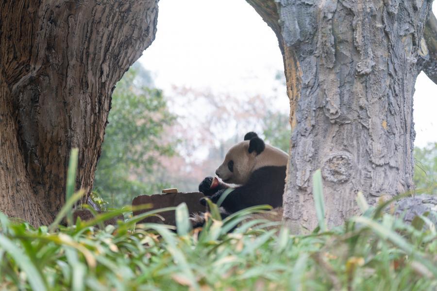 木のくぼみでリンゴを食べるシャンシャン。(12月8日撮影、成都=新華社配信/Panda365提供)
