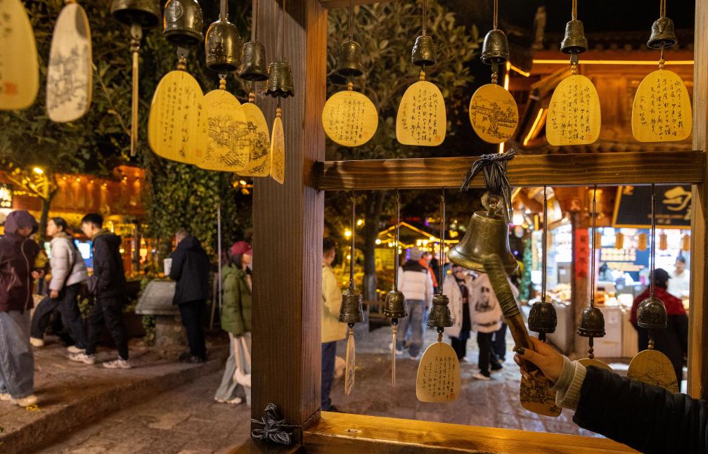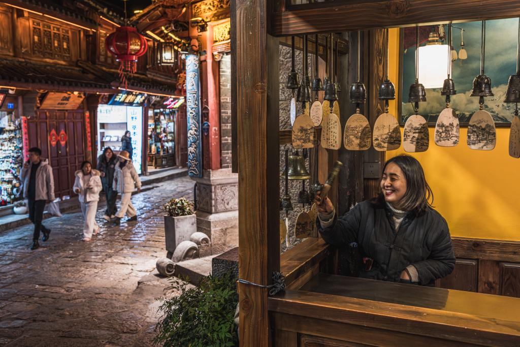 12日、麗江古城の土産物屋で、鈴を鳴らして観光客を呼び込むスタッフ。(麗江=新華社記者/王冠森)