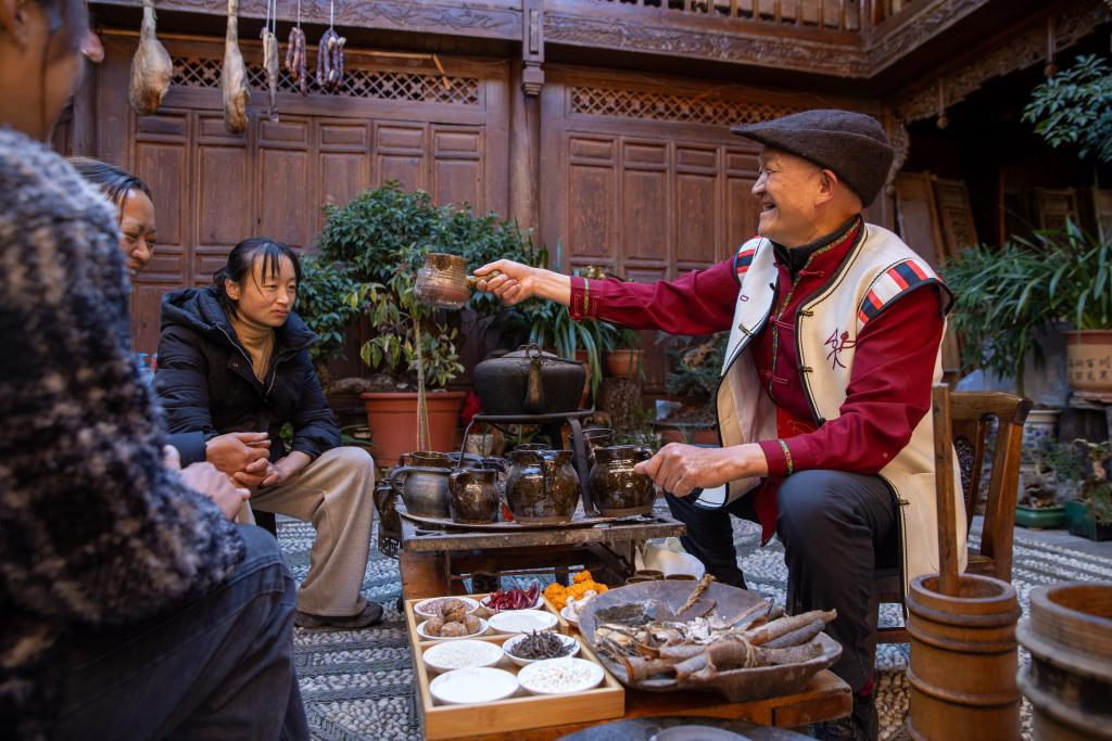 13日、麗江古城にある馬幇文化の博物館で、来館者を茶でもてなす館主の谷栄桂(こく・えいけい)さん(右)。(麗江=新華社記者/江文耀)