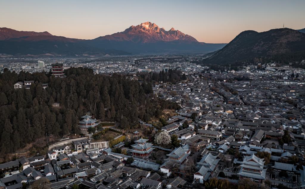 14日、麗江古城と玉竜雪山。(ドローンから、麗江=新華社記者/王冠森)