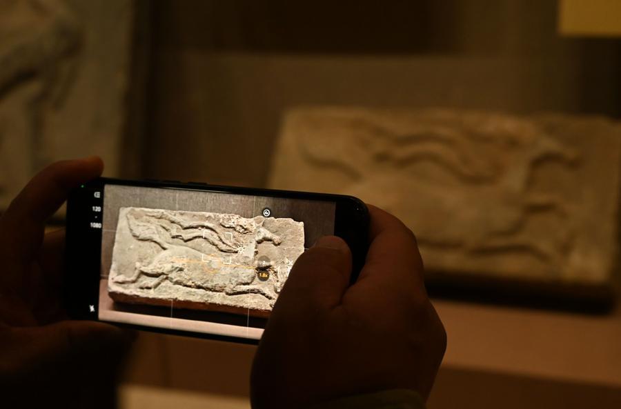 15日、敦煌市博物館で、「天馬磚」(唐代)を撮影する来館者。(敦煌=新華社配信/張暁亮)