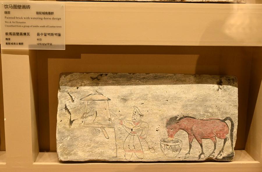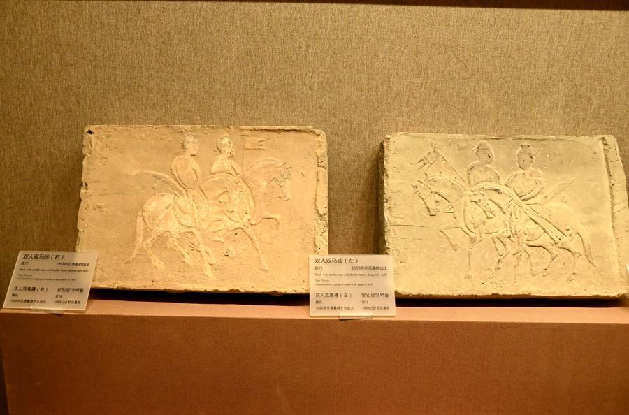 15日、敦煌市博物館に展示された「飲馬図画像磚」。(敦煌=新華社配信/張暁亮)