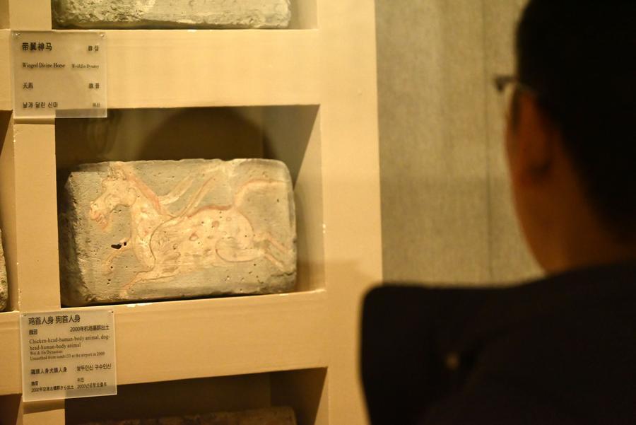 15日、敦煌市博物館で、「天馬磚」(唐代)を観賞する来館者。(敦煌=新華社配信/張暁亮)