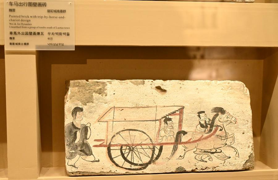 15日、敦煌市博物館に展示された「車馬出行図画像磚」。(敦煌=新華社配信/張暁亮)