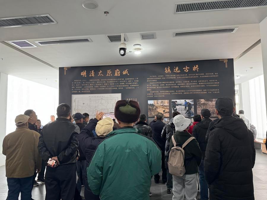 16日、鎮遠橋遺跡館で展示パネルを見る人たち。(太原=新華社記者/王学濤)