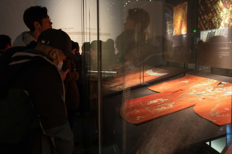 13日、成都博物館「金の糸-北アフリカから東アジアへ 黄金が織りなす装いの美」展で、孔府麒麟袍を見る人たち。(成都=新華社記者/胥氷潔)