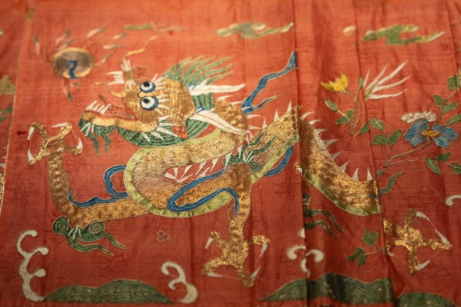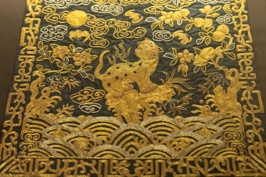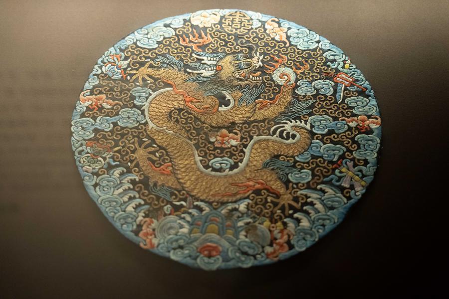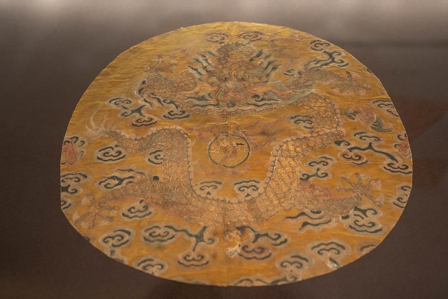 13日、成都博物館「金の糸-北アフリカから東アジアへ 黄金が織りなす装いの美」展に展示された盤金彩繍団竜補(ばんきんさいしゅうだんりゅうほ)。(成都=新華社記者/胥氷潔)