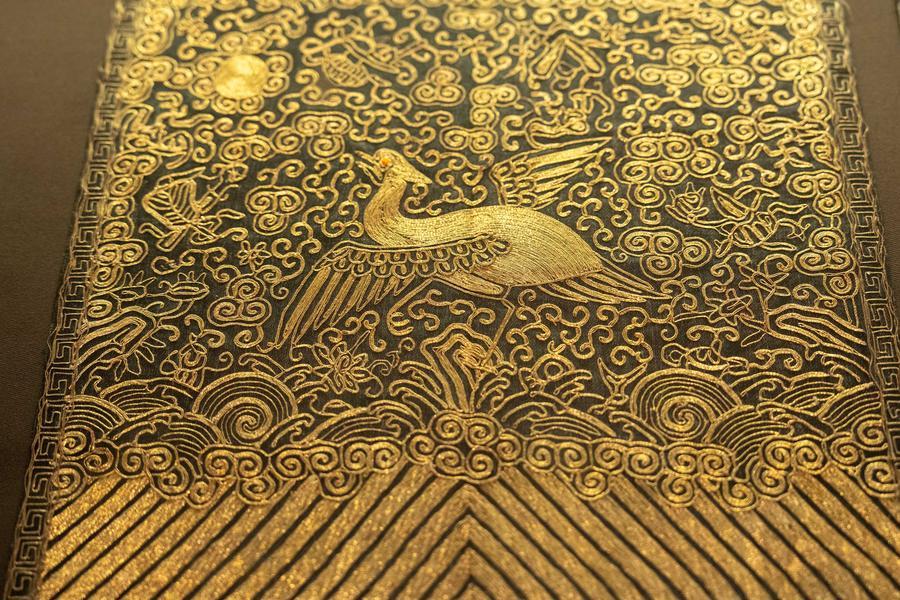 13日、成都博物館「金の糸-北アフリカから東アジアへ 黄金が織りなす装いの美」展に展示された盤金繍鸂鶒文方補(ばんきんしゅうけいちょくもんほうほ)。(成都=新華社記者/胥氷潔)