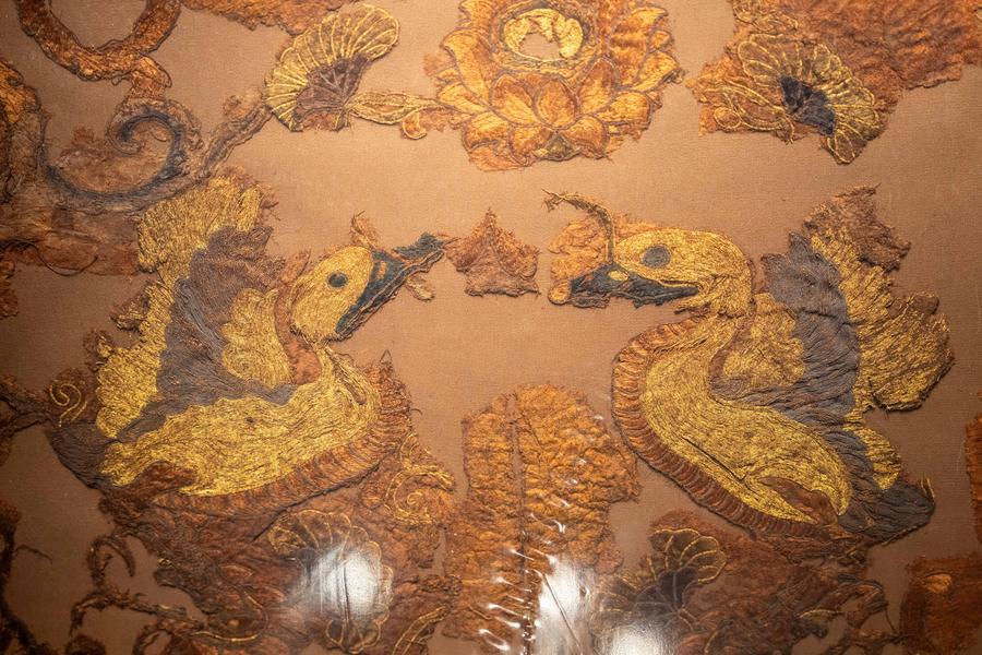 13日、成都博物館「金の糸-北アフリカから東アジアへ 黄金が織りなす装いの美」展に展示された芦雁荷花文綿被(ろがんかかもんめんひ)の刺しゅう。(成都=新華社記者/胥氷潔)