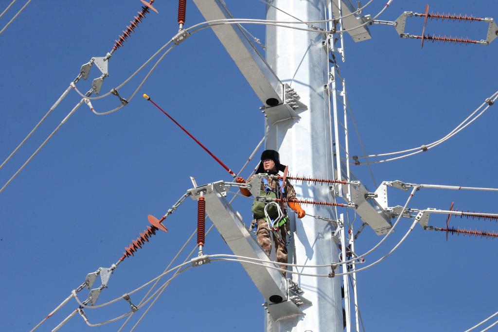 23日、66キロボルト建橋線86号送電塔を点検する国網本渓供電の職員。(本渓=新華社記者/潘昱竜)