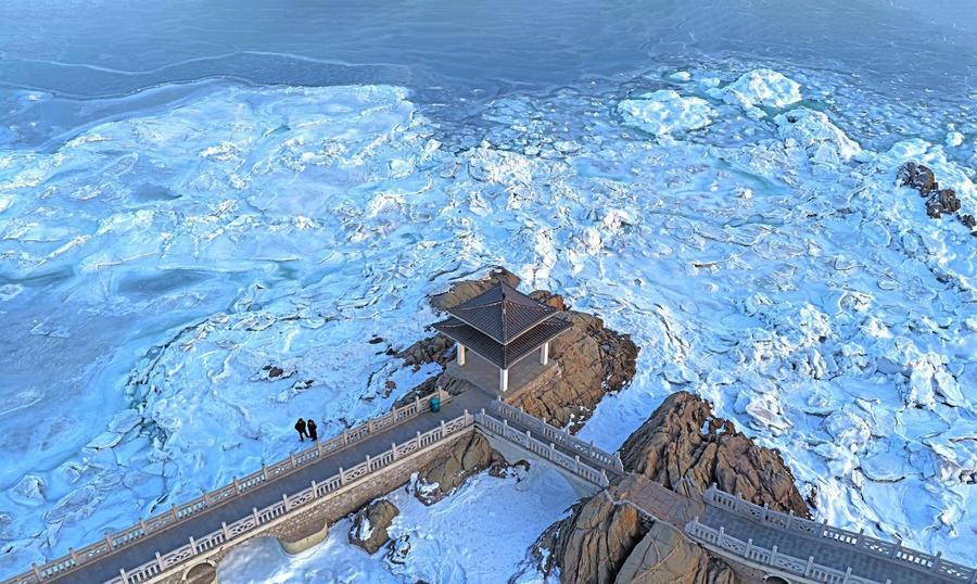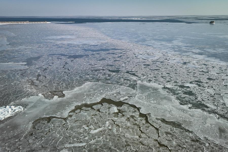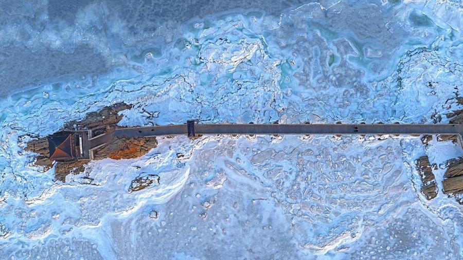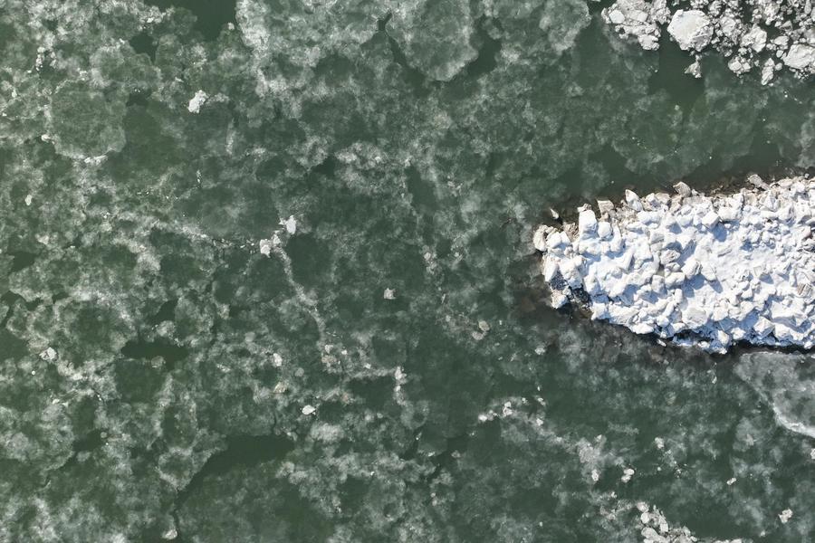 21日、遼寧省葫蘆島市綏中県で撮影した海氷。(ドローンから、葫蘆島=新華社記者/潘昱竜)
