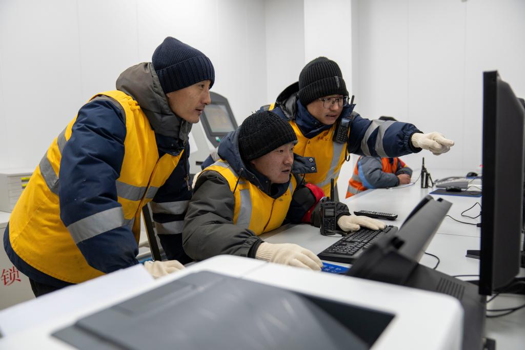 24日、扎加蔵布駅で集中監視データを確認する扎加蔵布信号工区の作業員たち。(ラサ=新華社記者/旦増尼瑪曲珠)