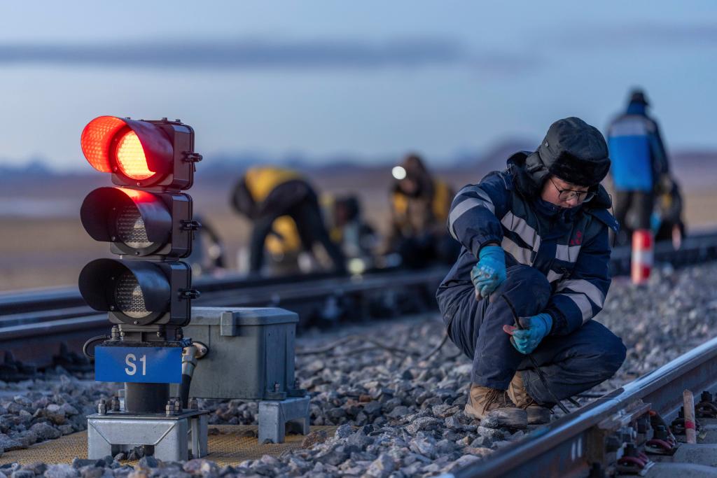 24日、扎加蔵布駅構内の信号設備を点検する扎加蔵布信号工区の作業員。(ラサ=新華社記者/旦増尼瑪曲珠)