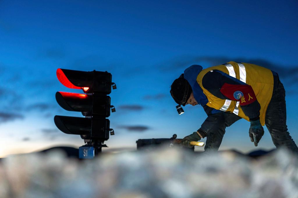 23日、信号機の保守作業にあたる扎加蔵布信号工区の作業員。(ラサ=新華社記者/旦増尼瑪曲珠)