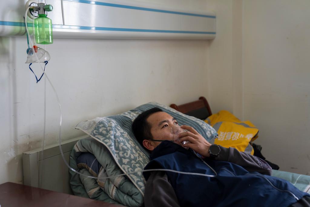 24日、宿舎で酸素を吸入する扎加蔵布信号工区の作業員。(ラサ=新華社記者/旦増尼瑪曲珠)