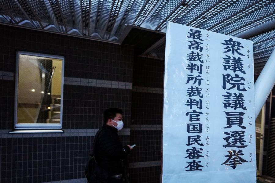 8日、東京都内の投票所前に看板を設置する職員。(東京=新華社記者/賈浩成)
