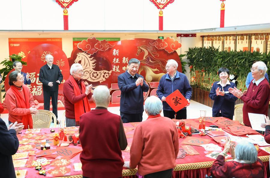 10日午前、北京市西城区の高齢者向け集合住宅を訪れ、高齢者と交流する習近平氏。(北京=新華社記者/謝環馳)