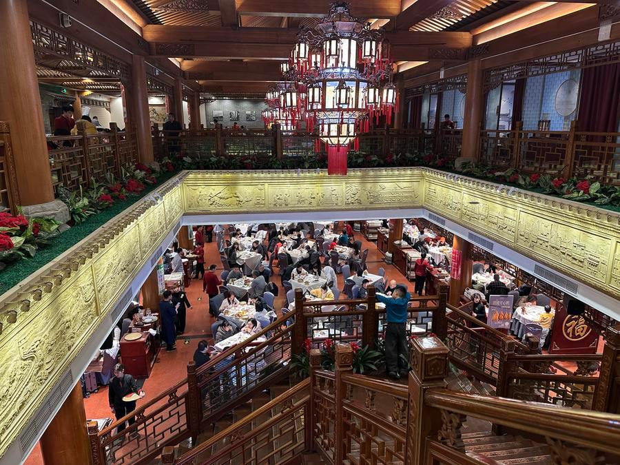 7日、北京市の前門大街にある全聚徳の創業店で北京ダックを味わう食事客。1864年創業の全聚徳は、伝統的な開放式の石窯にアヒルを掛けつるして焼く「掛炉烤鴨」で世界的に知られる。(北京=新華社記者/邱虹)