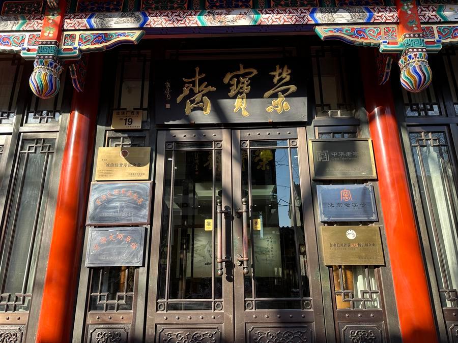 8日、北京市の瑠璃廠西街にあり、「文房四宝(筆、墨、紙、すずり)」や書画骨董の老舗として知られる栄宝斎(えいほうさい)。(北京=新華社記者/邱虹)