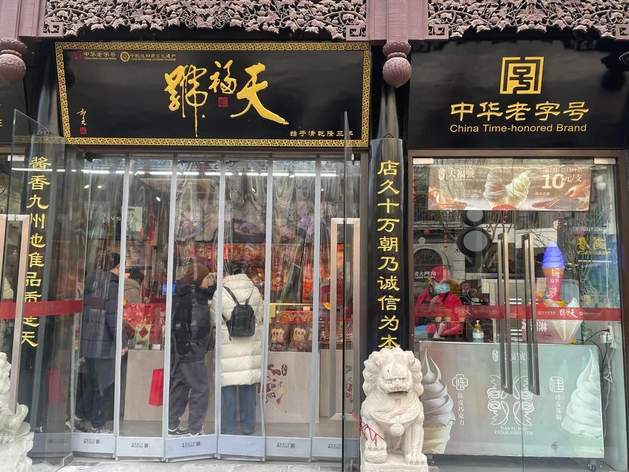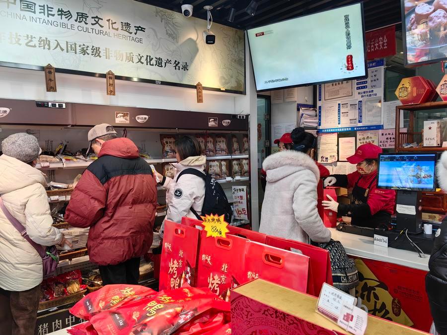 6日、北京の前門大街にある「中華老字号」企業の天福号で買い物する人々。(北京=新華社配信/江婧)