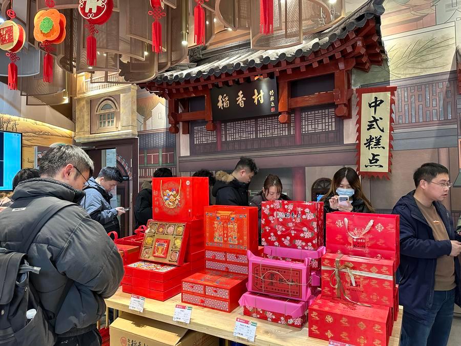 8日、北京稲香村「零号店」で菓子を買う人々。同店は2021年、北京・東四北大街の創業地にオープン。伝統菓子と流行文化を結び付け、グルメや文化、都市の歴史などを融合させた特色を打ち出している。(北京=新華社記者/邱虹)
