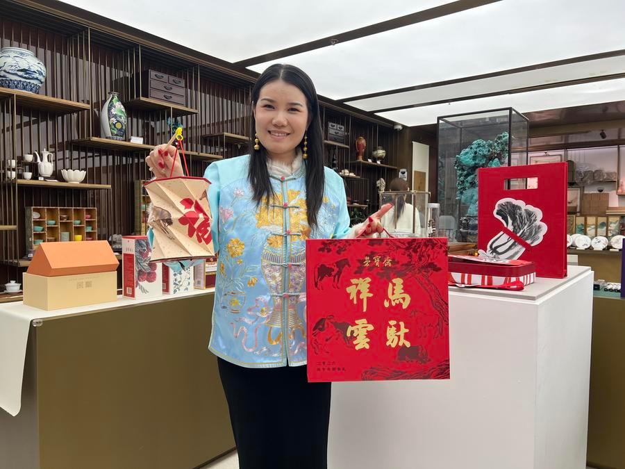 6日、「文房四宝」や書画骨董の老舗として知られる栄宝斎の文化クリエーティブショップで、新年向けの商品を見せるスタッフ。(北京=新華社配信/譚虹翔)
