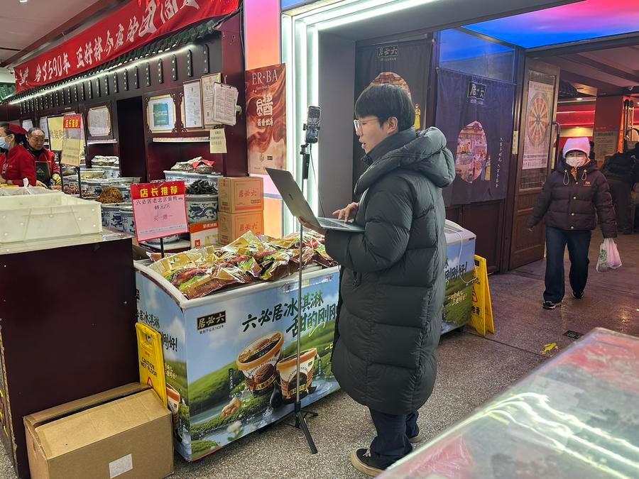 6日、前門にある六必居本店の店内で、ライブ配信を通じて商品を販売するスタッフ。(北京=新華社配信/謝瑞)
