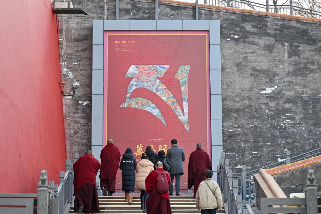 9日、故宮博物院「万法帰一・薩迦寺の歴史文化と芸術展」の展示ホールに向かう人たち。(北京=新華社記者/李鑫)