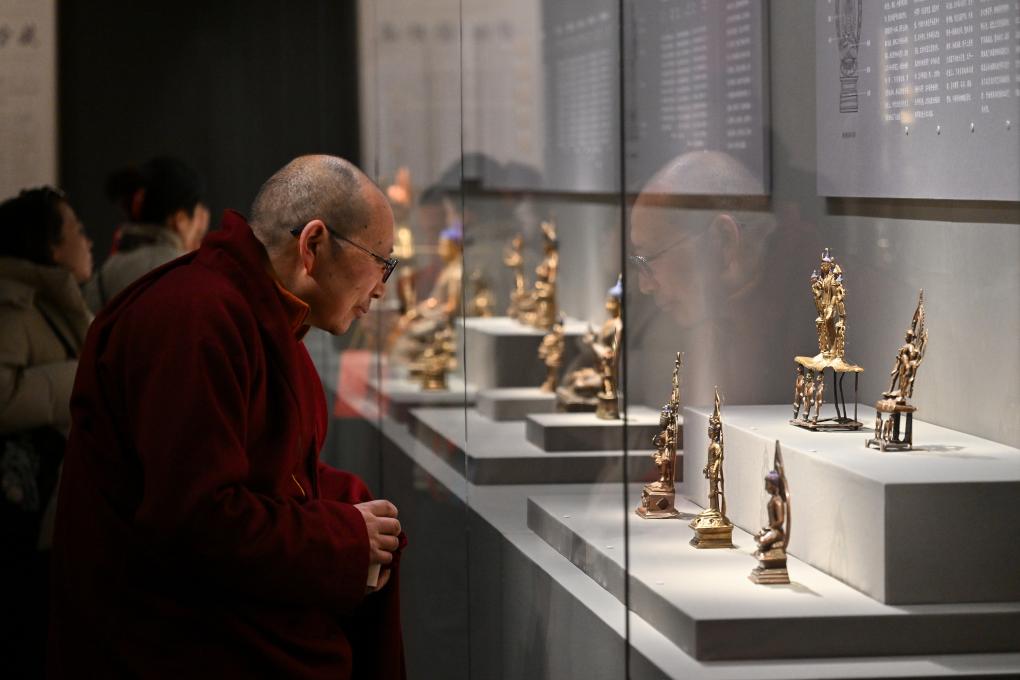9日、故宮博物院「万法帰一・薩迦寺の歴史文化と芸術展」で展示を見る人。(北京=新華社記者/李鑫)