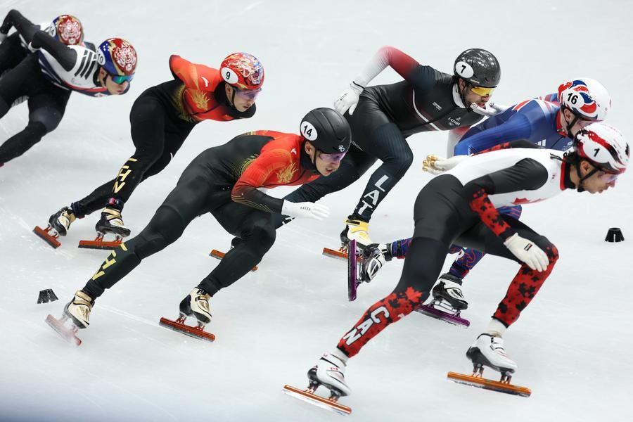14日、ミラノ・コルティナ冬季五輪スピードスケートのショートトラック男子1500メートル決勝に臨む中国の孫竜(そん・りゅう、左から3人目)と劉少昂(左から4人目)。(ミラノ=新華社記者/李明)