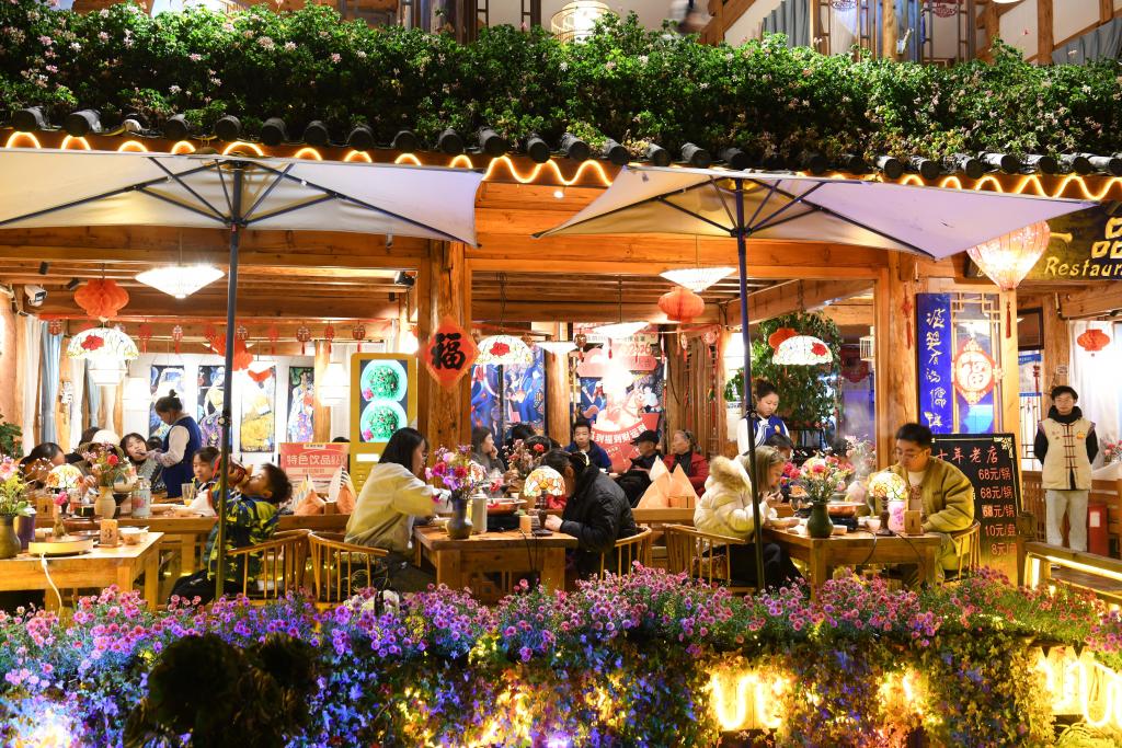 14日夜、麗江古城で食事を楽しむ観光客。(麗江=新華社配信/趙慶祖)