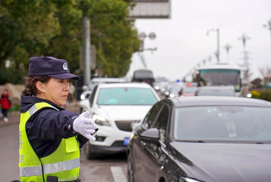 20日、武夷山国家公園風景区の交差点で車を誘導する警察官。(武夷山=新華社配信/彭剣偉)