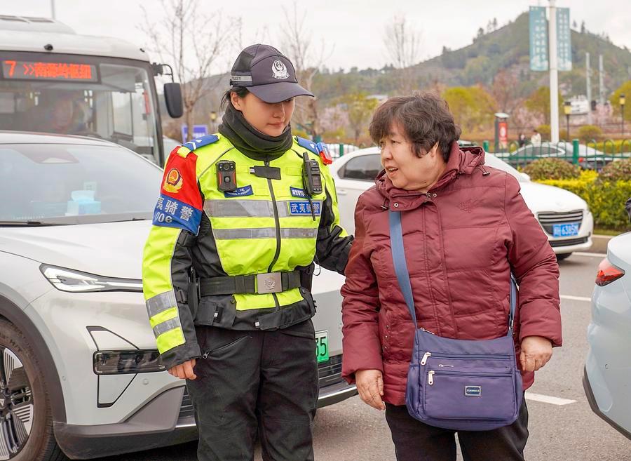 20日、武夷山国家公園風景区の交差点で高齢者に付き添う警察官。(武夷山=新華社配信/邱汝泉)