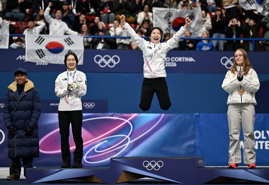 20日、表彰式に臨む(手前左から)銀メダルを獲得した韓国の崔珉禎(チェ・ミンジョン)、金メダルを獲得した韓国のキム・ギルリ、銅メダルを獲得した米国のコリーヌ・スタダード。(ミラノ=新華社記者/程敏)
