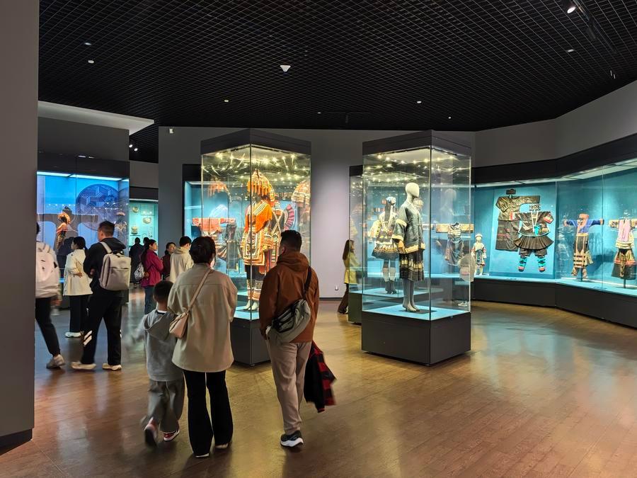 18日、広西民族博物館で伝統民族衣装を見る人たち。(南寧=新華社記者/黄慶剛)