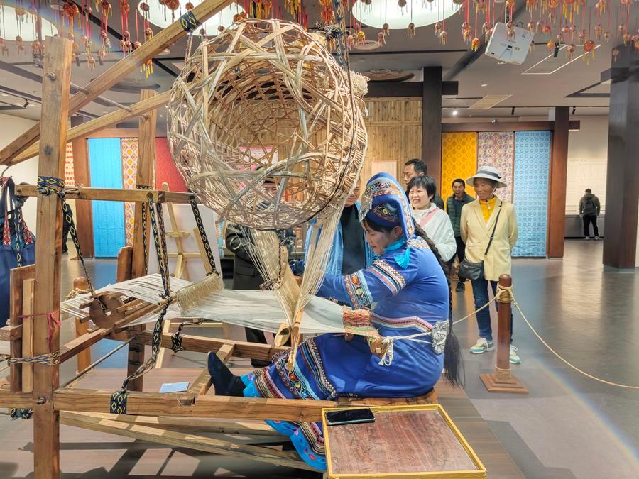 18日、広西民族博物館で、織物技術に関する展示を見る人たち。(南寧=新華社記者/黄慶剛)