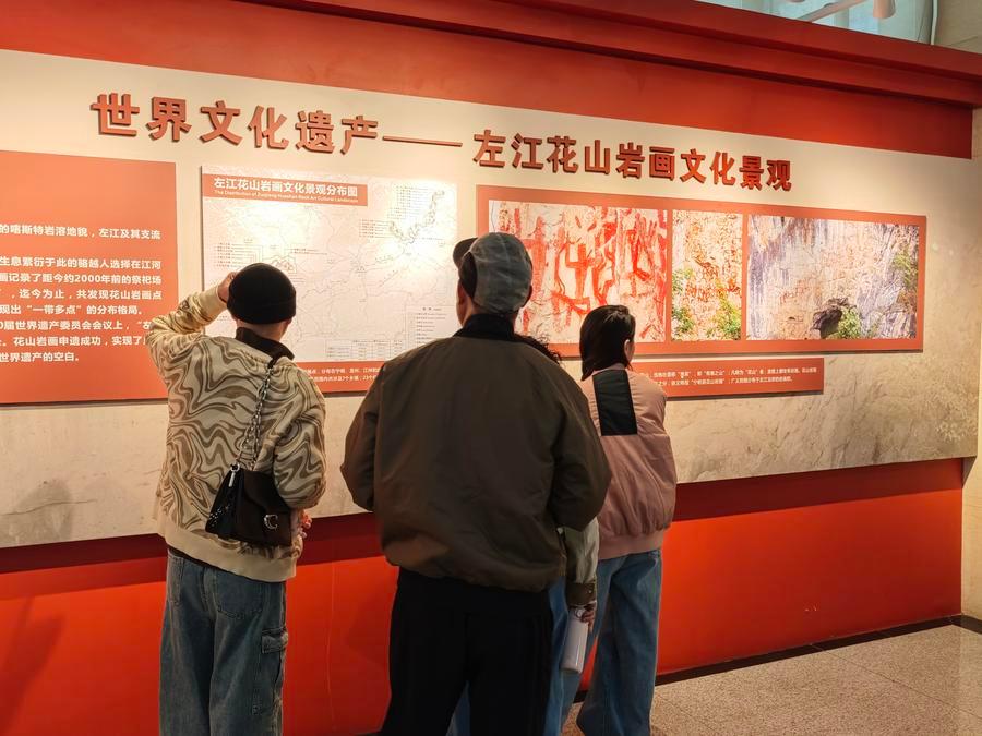18日、広西民族博物館で、世界文化遺産「左江花山の岩絵の文化的景観」に関する説明を見る人たち。(南寧=新華社記者/黄慶剛)