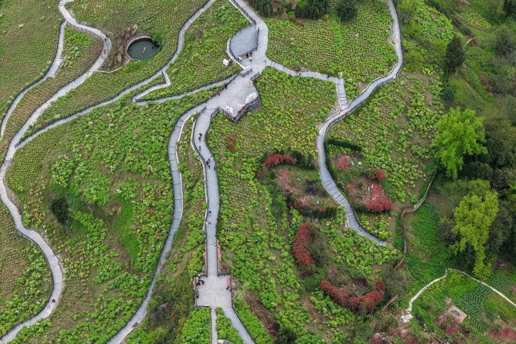 27日、重慶市墊江県太平鎮牡丹村の愷之峰観光区。(ドローンから、重慶=新華社記者/黄偉)