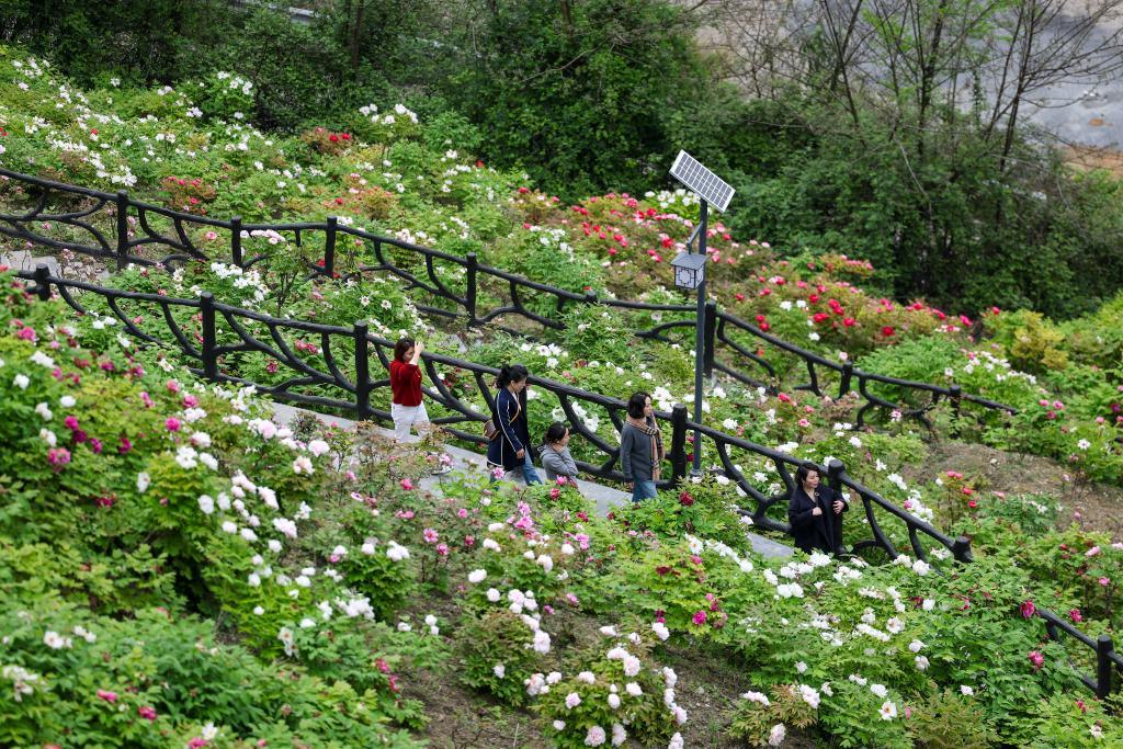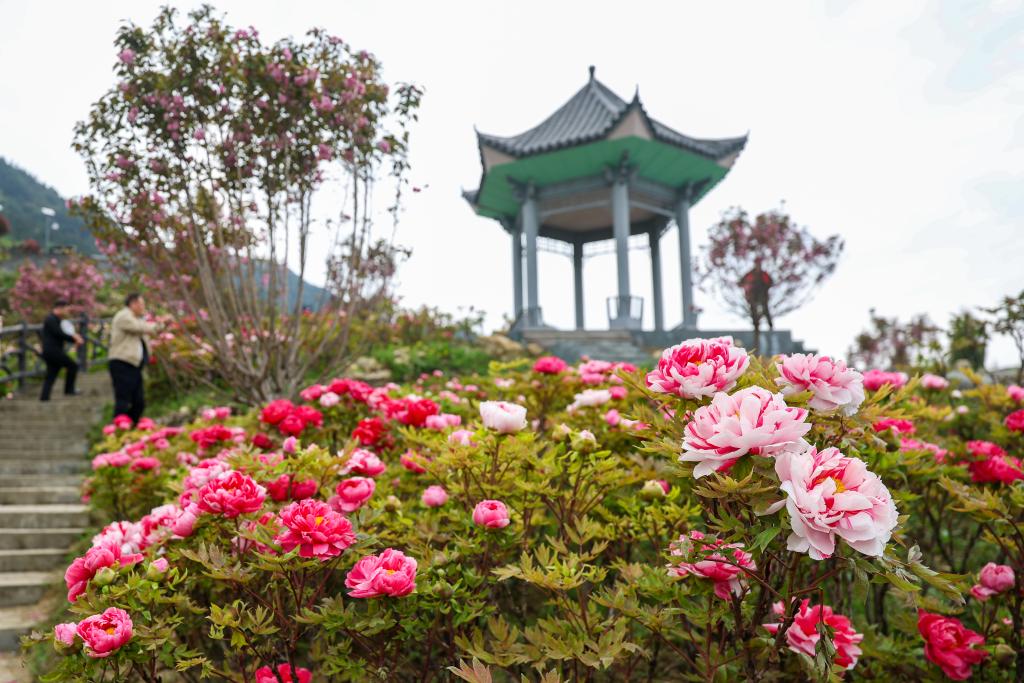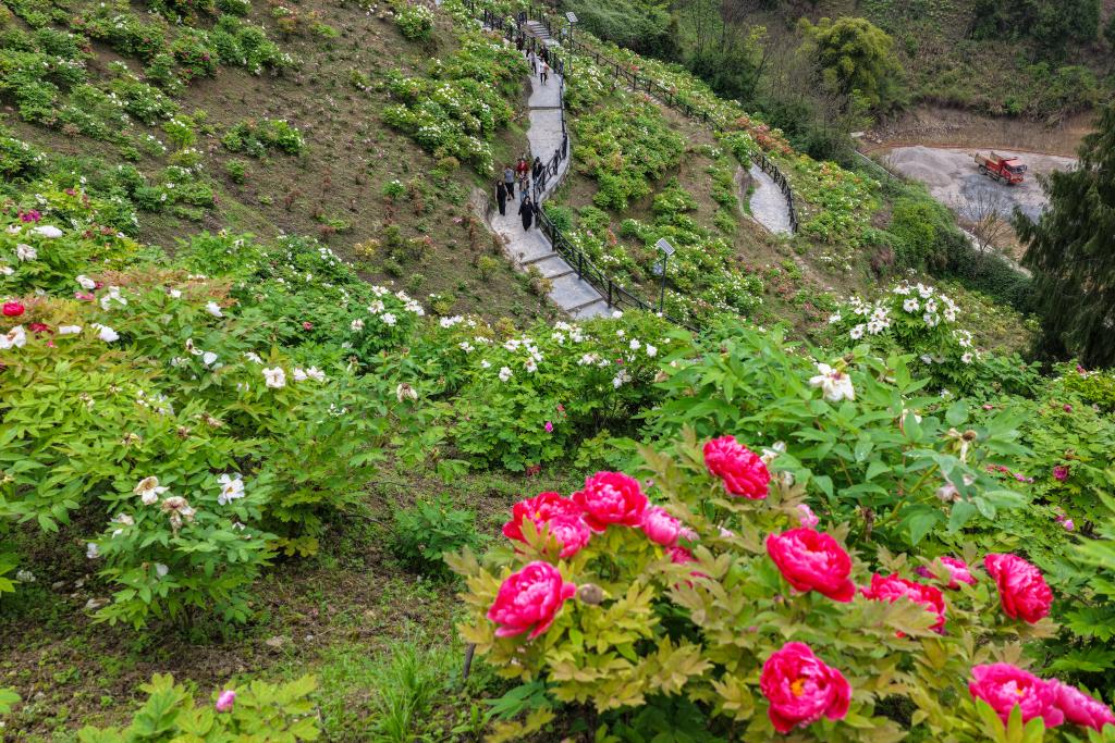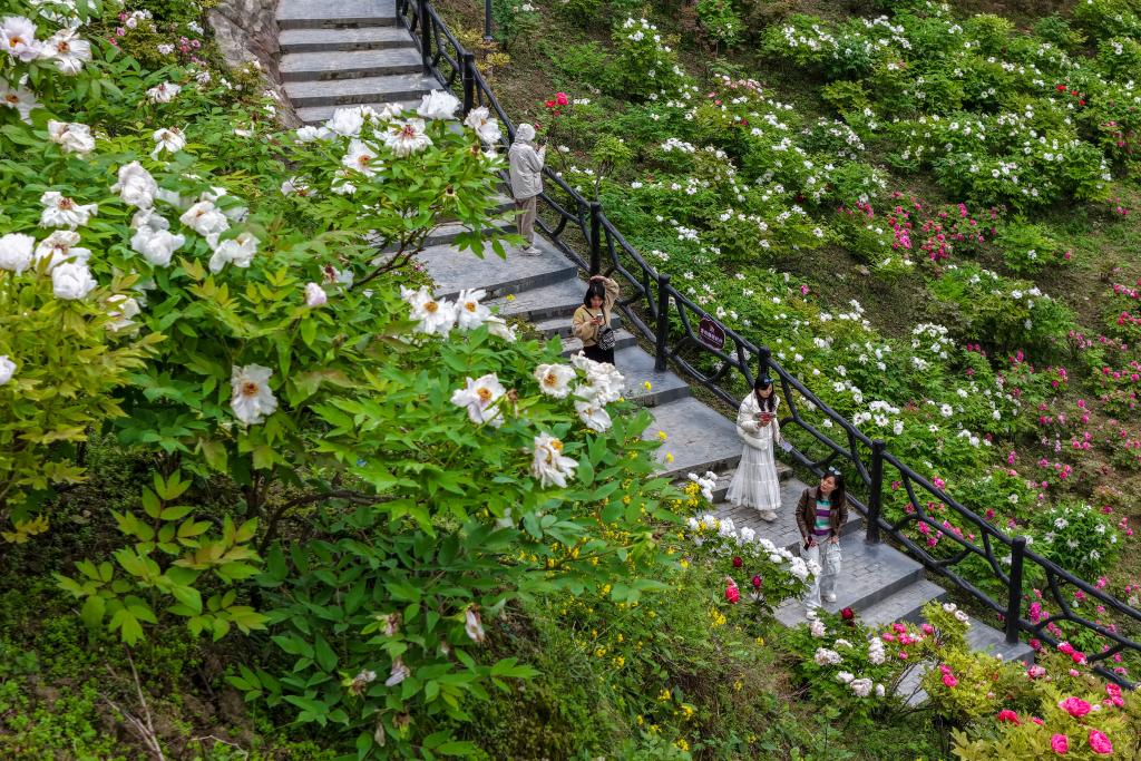 27日、重慶市墊江県太平鎮牡丹村の愷之峰観光区で、ボタンの花見を楽しむ観光客。(重慶=新華社記者/黄偉)